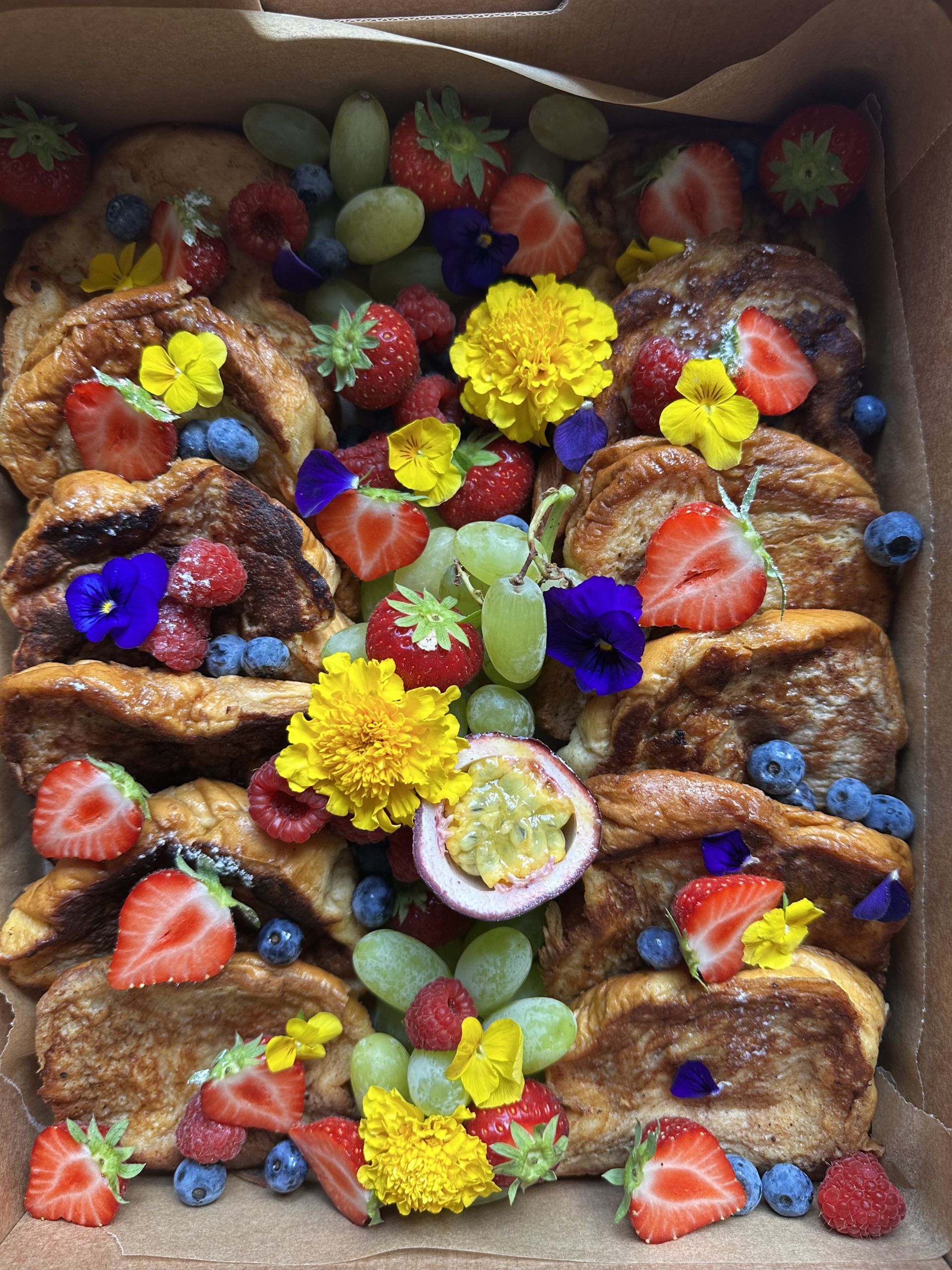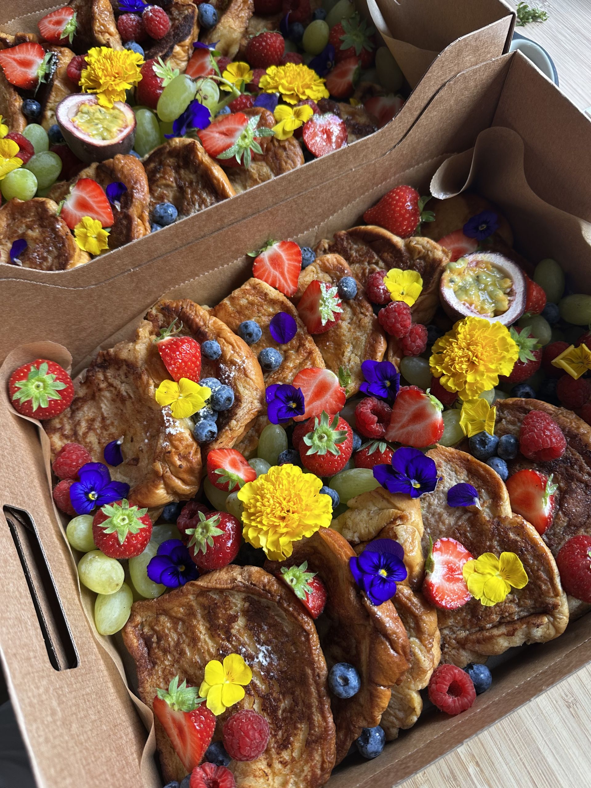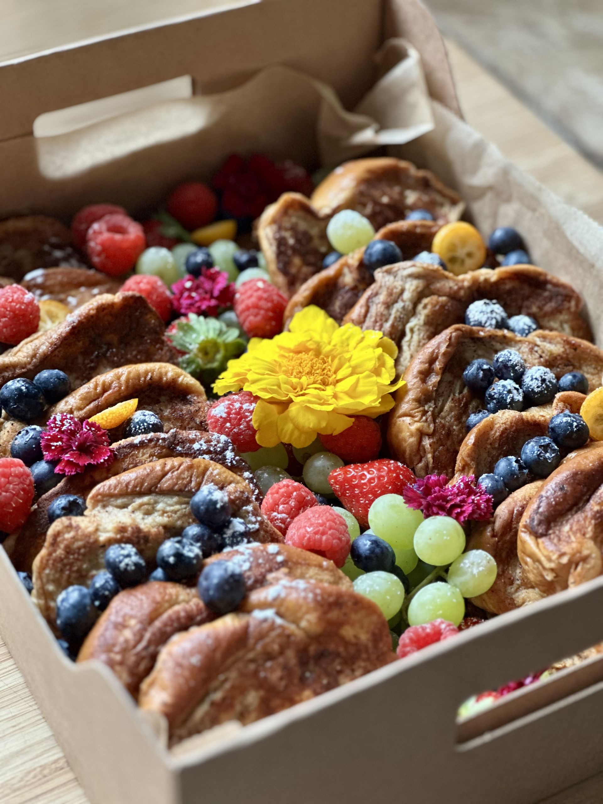 Les box sont composées de 15 brioches perdues et de fruits frais. Nous vous conseillons de l'agrémenter d'une box pancakes ainsi que d'une box dessert pour un brunch complet et gourmand.